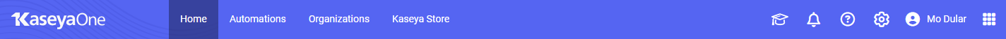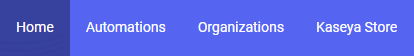 Navigating to Home, Automations, or Organizations from the top navigation menu populates a dynamic left navigation menu that provides access to relevant pages within those core areas. Navigating to Kaseya Store redirects you to Kaseya Store.