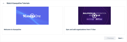 Visible to users with the Master, Billing, or User role, this widget contains onboarding walkthroughs, demos, and tutorials embedded as videos within KaseyaOne. These videos feature content on both KaseyaOne and other modules.