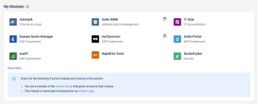 This widget displays the modules you have a user account for and have been granted access to in KaseyaOne. To see the full list of modules, click Show More, if applicable.