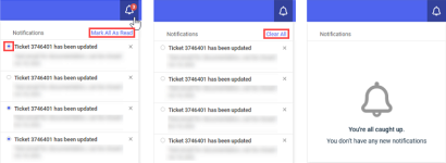 Conveniently keep up with any updates to your active tickets. A red circle on the notifications icon indicates unread notifications. To mark notifications as read, click the selector for individual notifications or click Mark All As Read. |