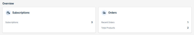 Visible to users with the Master or Billing role, theOverview section contains widgets showing summaries of your account's Kaseya Store subscriptions and orders.