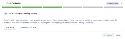 If your account setup is not yet finished, click Next or Previous to browse through the incomplete checklist tasks. Click the action buttons to navigate directly to the admin settings pages in KaseyaOne, where you can complete the tasks. If you wish to skip a step, which makes the task appear as completed in the setup widget and Skipped on the Setup Summary page, click Acknowledge and Skip.