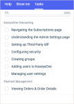 Kick-start your KaseyaOne experience with in-product walkthroughs.![]() The Tasks tab, selected by default, tracks your progress as you are guided through onboarding tasks directly in the user interface. Click the Show me tab to access additional guides. Yyou can type keywords in the search bar to filter for relevant resources. Find additional help resources in the Help tab, or refer to the Help menu. |