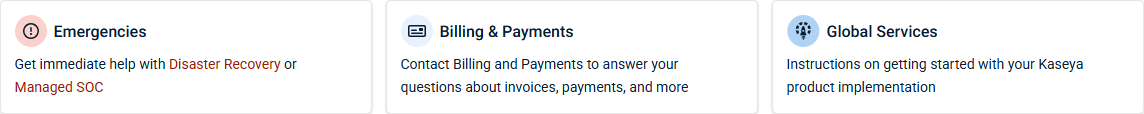 For emergencies, billing and payment questions, and product implementation guidance, relevant information is available on the Kaseya Helpdesk home page.