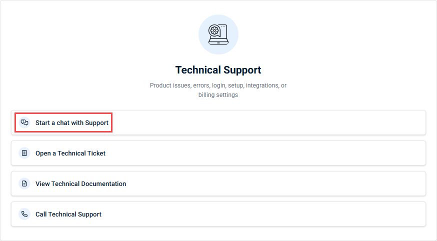 - In the Technical Support section at the bottom of the page, click Start a chat with Support.