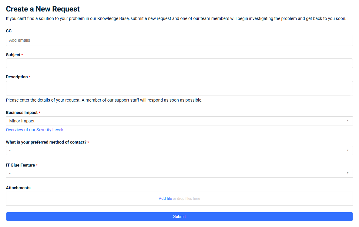 - On the Create a New Request page, enter information in all required fields. You can also opt to CC others on the support ticket by entering email addresses or attach files. Some module's forms include extra, module-specific fields.