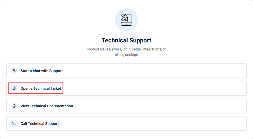 - From the Technical Support section at the bottom of the page, you can start a live chat (available only for certain modules), open a ticket, open the product's dedicated help system (such as this one), or call an agent. To submit a request that generates a ticket for the Support team, click Open a Technical Ticket.