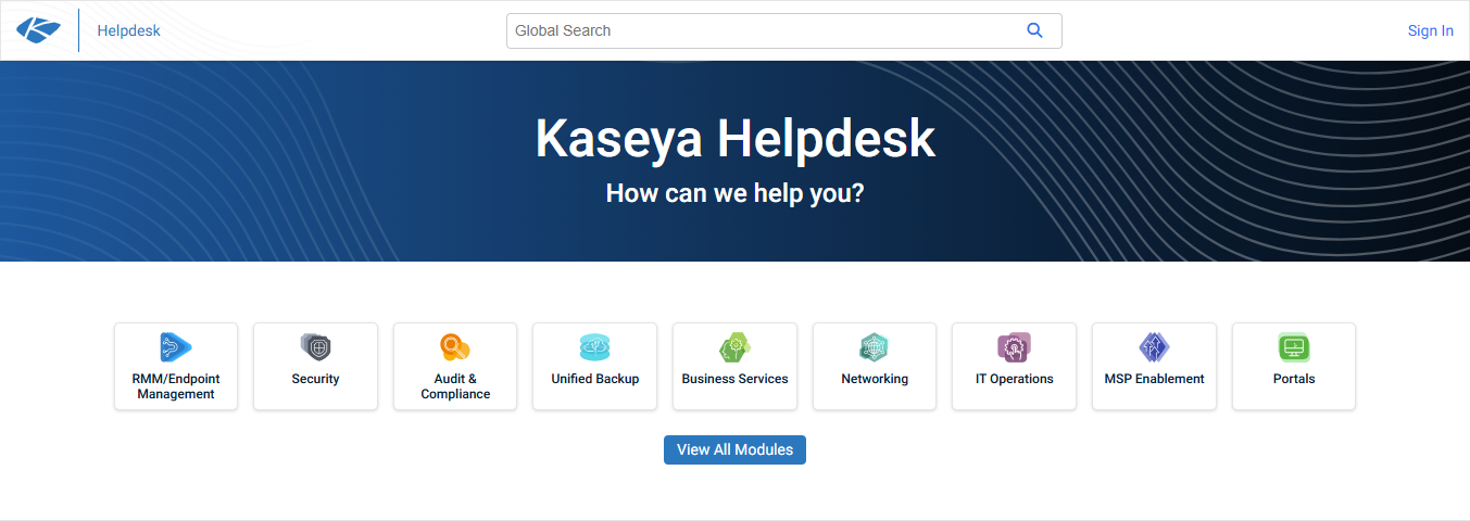 Before submitting a support request, explore our help articles and knowledge base resources. From the Kaseya Helpdesk home page, select the relevant module to browse articles, or use the search bar at the top of the page. If you are unable to resolve your issue, chat with a Support representative or open a support ticket, as detailed in this article.