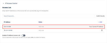 If you are managing a large number of IP addresses, you can use the Search keywords... search bar in the IP Access Control section to locate a specific address. You can also search for components of the IP address or keywords in the Notes field.
