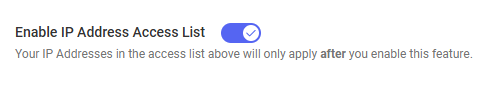 - Turn on the Enable IP Address Access List toggle to enable the feature. The toggle is disabled until you add your current IP address to the allowlist.