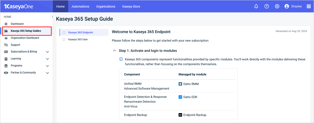 - Your Kaseya 365 Setup Guide page contains activation links for new modules. These links expire within seven days of receiving the Welcome to Kaseya 365 email. Be sure to activate your modules before the links expire. (See Step 1: Activate and login to modules below for details.)