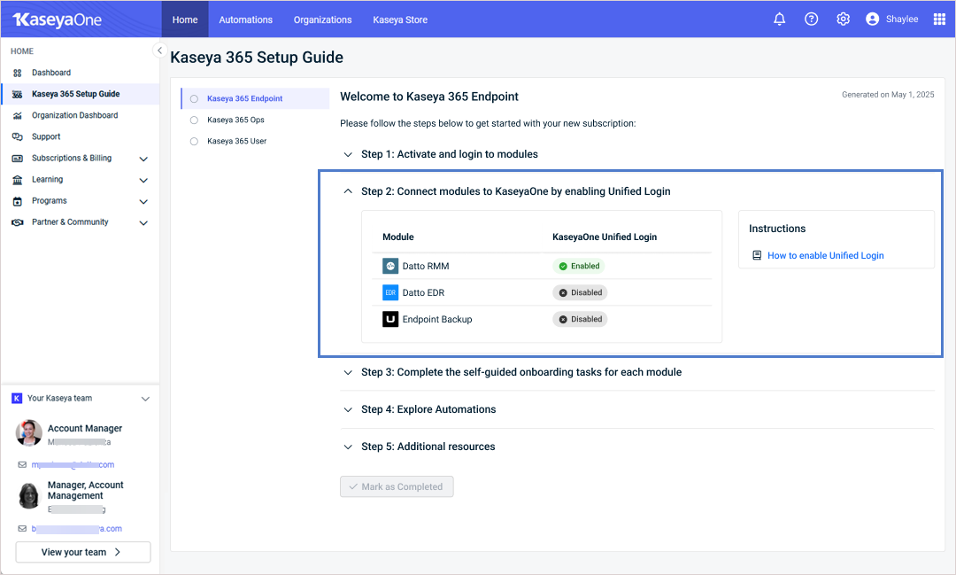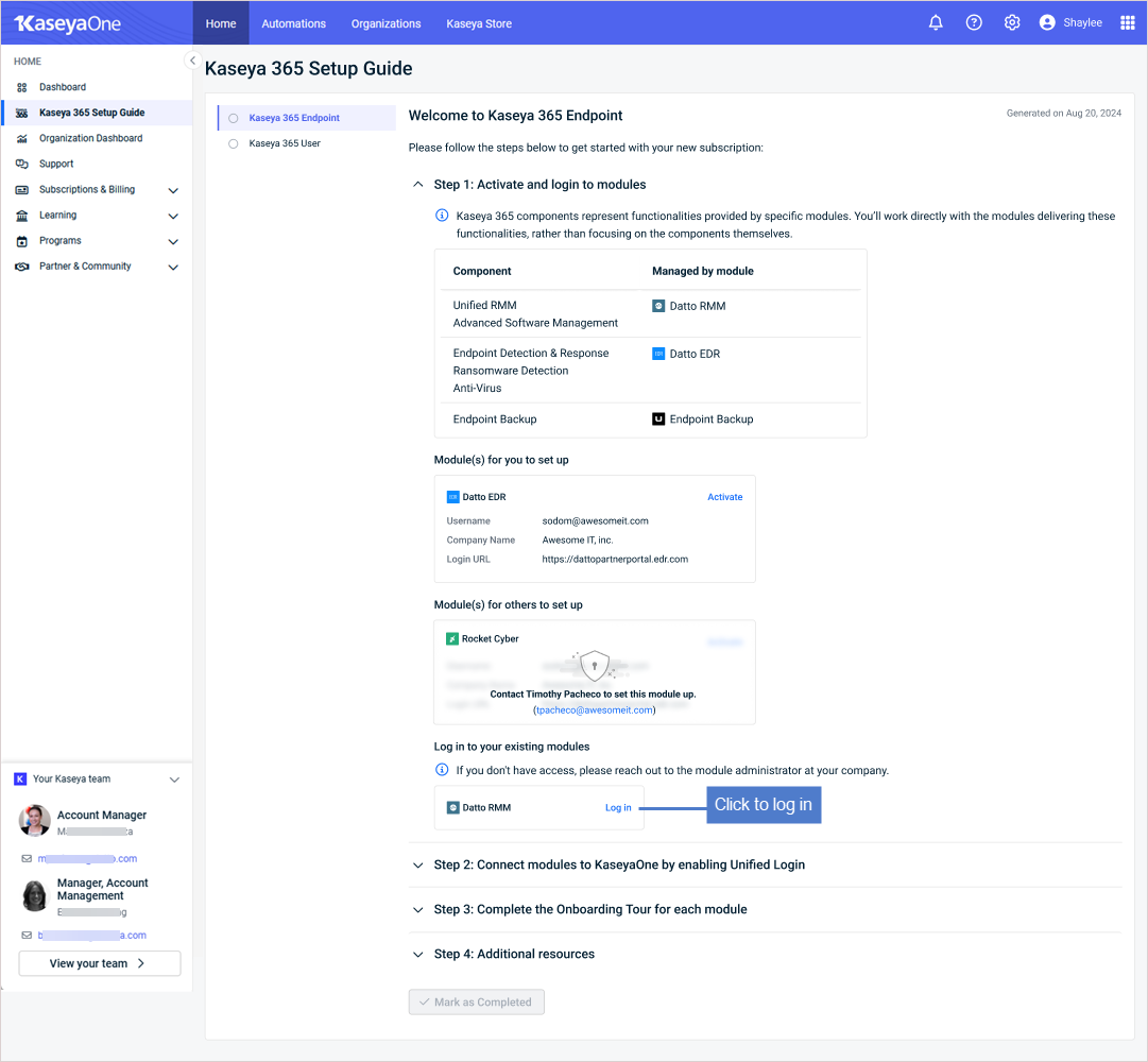 - Step 1: Activate and log in to modules: Each new module has a designated implementation contact who must activate that module. All KaseyaOne Master users can view this step in the guide, but functionality is limited if you are not the module’s designated implementation contact.