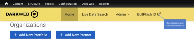 NOTE A single user login account is used to access both Dark Web ID and BullPhish ID. Once your Dark Web ID credentials are set up, you can use the same credentials to log into BullPhish ID directly. Updating the password in either module will update it for both. It is recommended to activate Dark Web ID first, then access BullPhish ID directly from the Dark Web ID UI (without clicking BullPhish ID's Activate link on the Kaseya 365 Setup Guide page) as shown here: