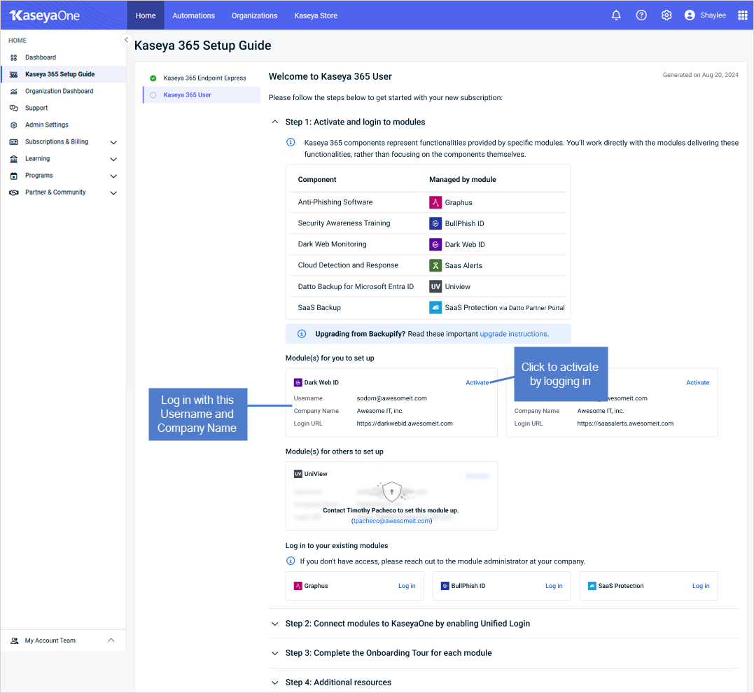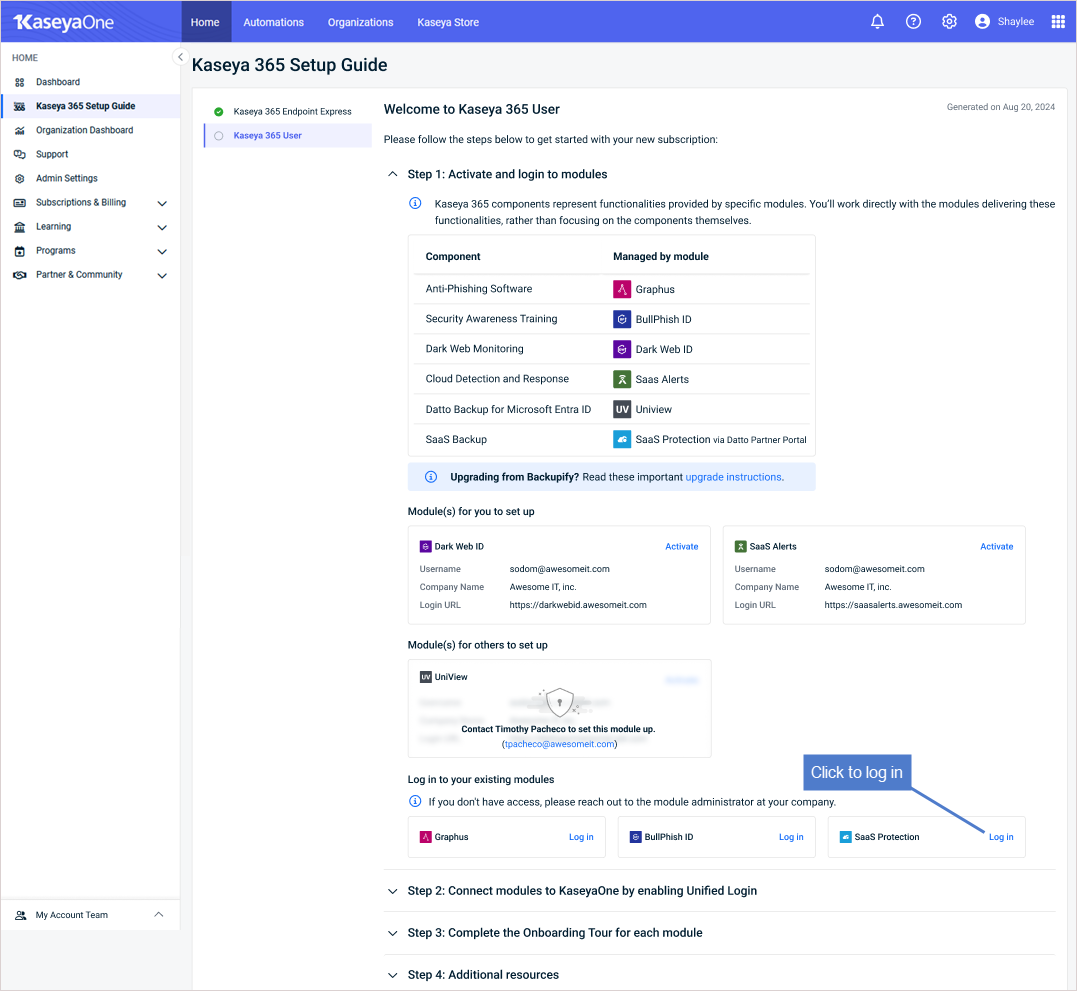 - Step 1: Activate and log in to modules: Each new module has a designated implementation contact who must activate that module. All KaseyaOne Master users can view this step in the guide, but functionality is limited if you are not the module’s designated implementation contact.