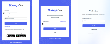 - If you're not already logged in to KaseyaOne, the KaseyaOne login page opens, prompting you to log in — enter your KaseyaOne credentials and then the verification code.