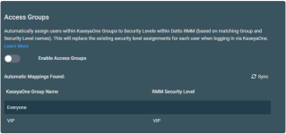 IMPORTANT Before enabling this feature, make sure that your KaseyaOne groups are assigned the Datto RMM module and that you have created new or renamed existing Datto RMM security levels to match the KaseyaOne group names (names are case insensitive) and level of user access.
