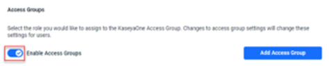 If you enable Access Groups, then RBAC from KaseyaOne will be allowed for the module and you will be able define mapping rules (by mapping KaseyaOne groups to the same or similar module roles) to control user access.