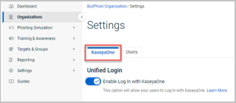 - Log in to BullPhish ID and on your Organization's dashboard, click Settings. The Settings page opens with the KaseyaOne tab selected. In the Unified Login section, make sure that the Enable Log In with KaseyaOne toggle is turned on.