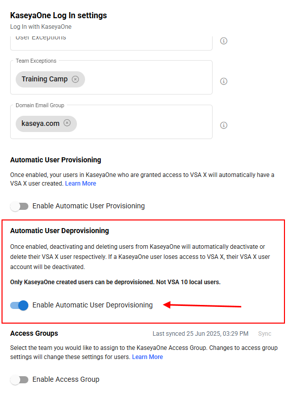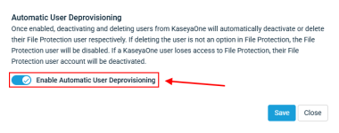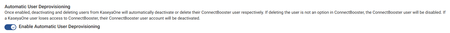 If you disable Automatic User Deprovisioning, then you must manually deactivate or delete/disable module users whenever they are deactivated or deleted in KaseyaOne.