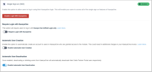 - Go to the Single Sign-on (SSO) section of the page that shows the KaseyaOne logo and make sure that KaseyaOne SSO is enabled.