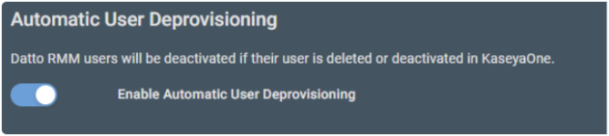 - Turn on the Enable Automatic User Deprovisioning toggle to allow just-in-time user deprovisioning for Datto RMM.