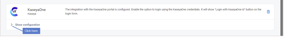 - Go to the Integrations tab, locate the KaseyaOne integration and click Show configuration.