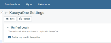 - In the Unified Login section, turn on Enable Log In with KaseyaOne.