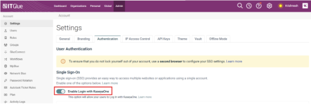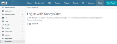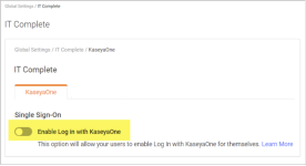 - Go to the KaseyaOne tab and turn on the Enable Log In with KaseyaOne toggle.