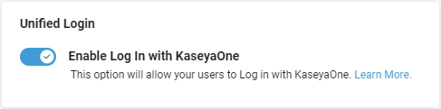 - Turn on the Enable Log In with KaseyaOne toggle to enable Unified Login for Powered Services.