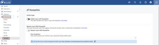 To enable Log In with KaseyaOne for ConnectBooster, do the following: