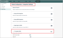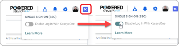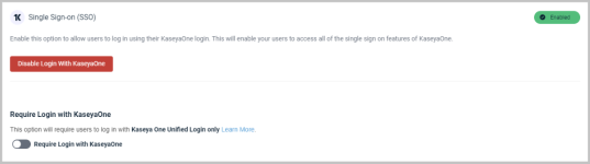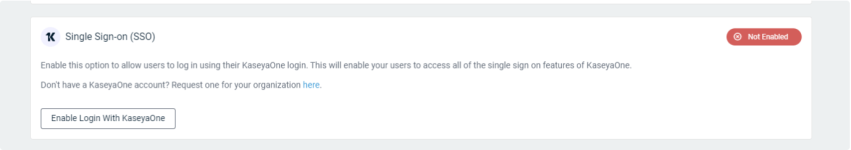 Go to the Single Sign-on section of the page that opens and click Enable Log In with KaseyaOne to enable the feature.