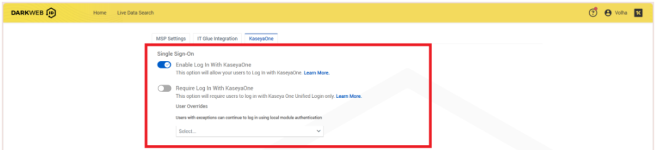 To enable Log In with KaseyaOne for Dark Web ID, do the following: