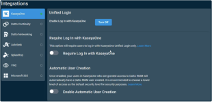 Unified Login for Datto File Protection is now enabled and users will automatically gain access to Datto File Protection through Log In with KaseyaOne. For more information, refer to KaseyaOne Unified Login in the Datto File Protection Manager Help.