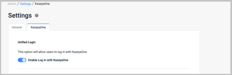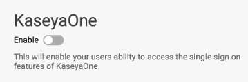 - Go to the KaseyaOne tab and turn on the Enable Log In with KaseyaOne toggle to enable the feature.