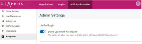 Unified Login for Graphus is now enabled and users will automatically gain access to Graphus through Log In with KaseyaOne. For more information, refer to Enabling KaseyaOne Unified Login for Graphus in the Graphus Help.