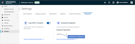 NOTE If you are using Spanning Backup with a Kaseya 365 User subscription, the KaseyaOne integration may already be enabled. If you do not see the Integrate button, the integration has already been added. Click Show Configuration to view the integration settings. Ensure that the Enable Login with KaseyaOne toggle is enabled.