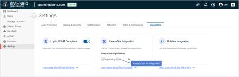 Unified Login for Spanning is now enabled, and all users will automatically gain access to Spanning through Log In with KaseyaOne. For more information, refer to the Spanning Backup for Microsoft 365 online help.