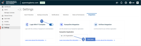Unified Login for Spanning is now enabled, and all users will automatically gain access to Spanning through Log In with KaseyaOne. For more information, refer to the Spanning Backup for Google Workspace online help.