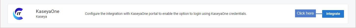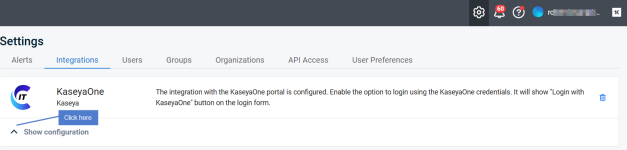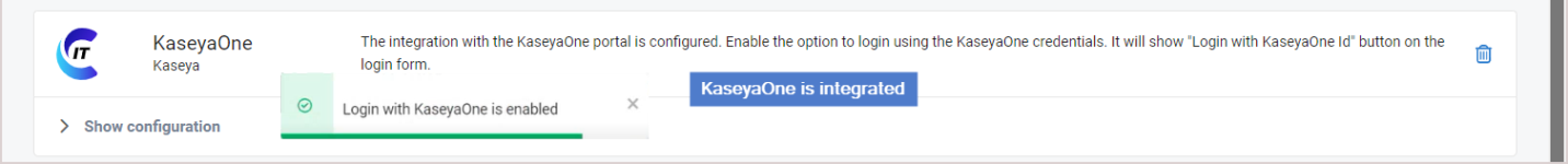 - (Optional) View the Login with KaseyaOne setting on the Integrations tab by clicking Show Configuration: