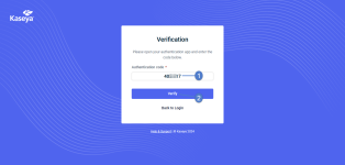 - The KaseyaOne login page opens, prompting you to log in. Enter your KaseyaOne credentials and then the verification code.