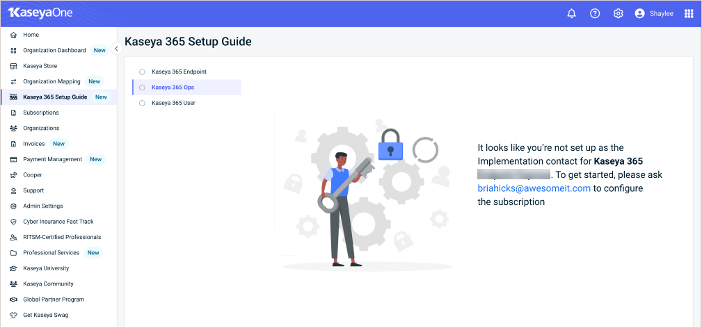 Note: If you are the implementation contact and were already using KaseyaOne without the Master role, you will be able to view the Kaseya 365 Setup Guide but will need the Master role to enable Unified Login for your Kaseya 365 Ops modules. Request a Master role account from your KaseyaOne administrator.