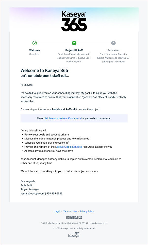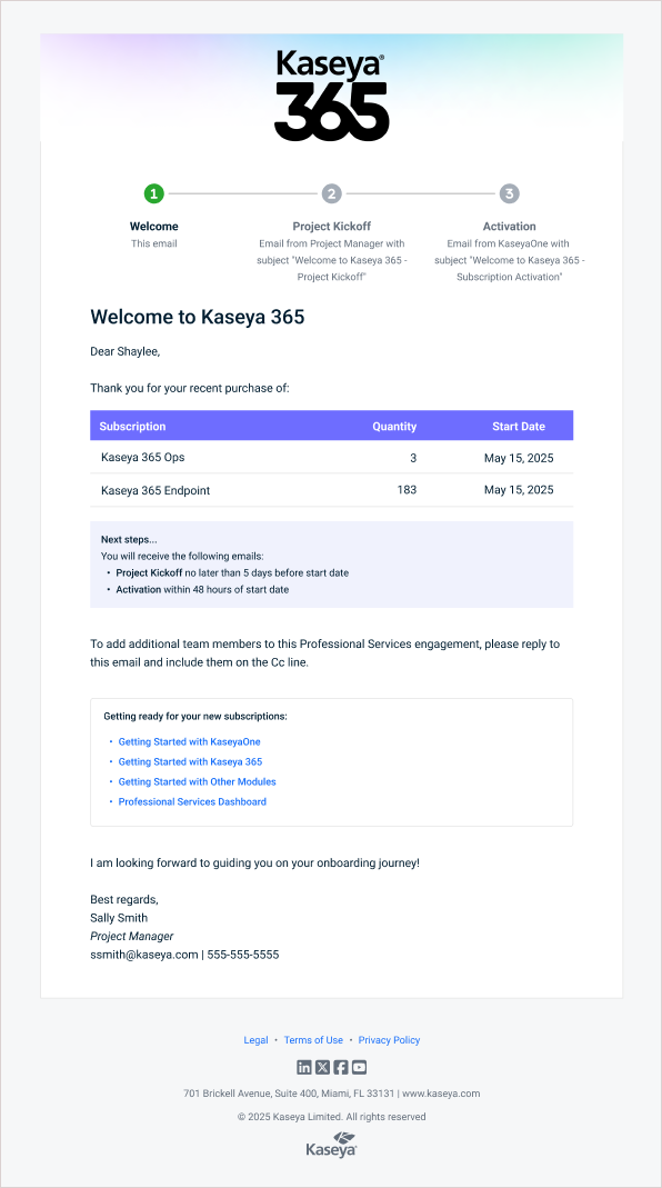 The Welcome to Kaseya 365 email is sent to the subscription's implementation contact.