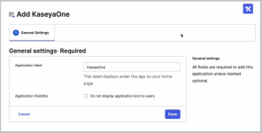Click Done on the General Settings page - the Application label is already set to KaseyaOne.