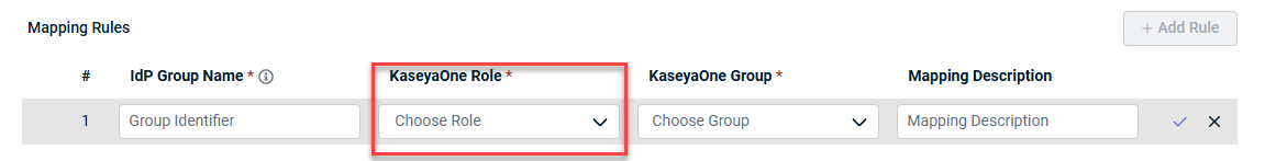 - Select one KaseyaOne Role from the drop-down list. You can map an IdP group to more than one KaseyaOne Role.