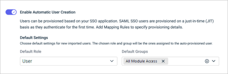 - Enable Automatic User Creation. This allows just-in-time provisioning for the third-party IdP SSO application so that user accounts are automatically created with a specified default role when new users authenticate for the first time.