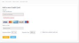 On the Add a New Credit Card page that opens, enter the following information: Credit Card Number, Name on Card, Expiration Month, and Expiration Year.