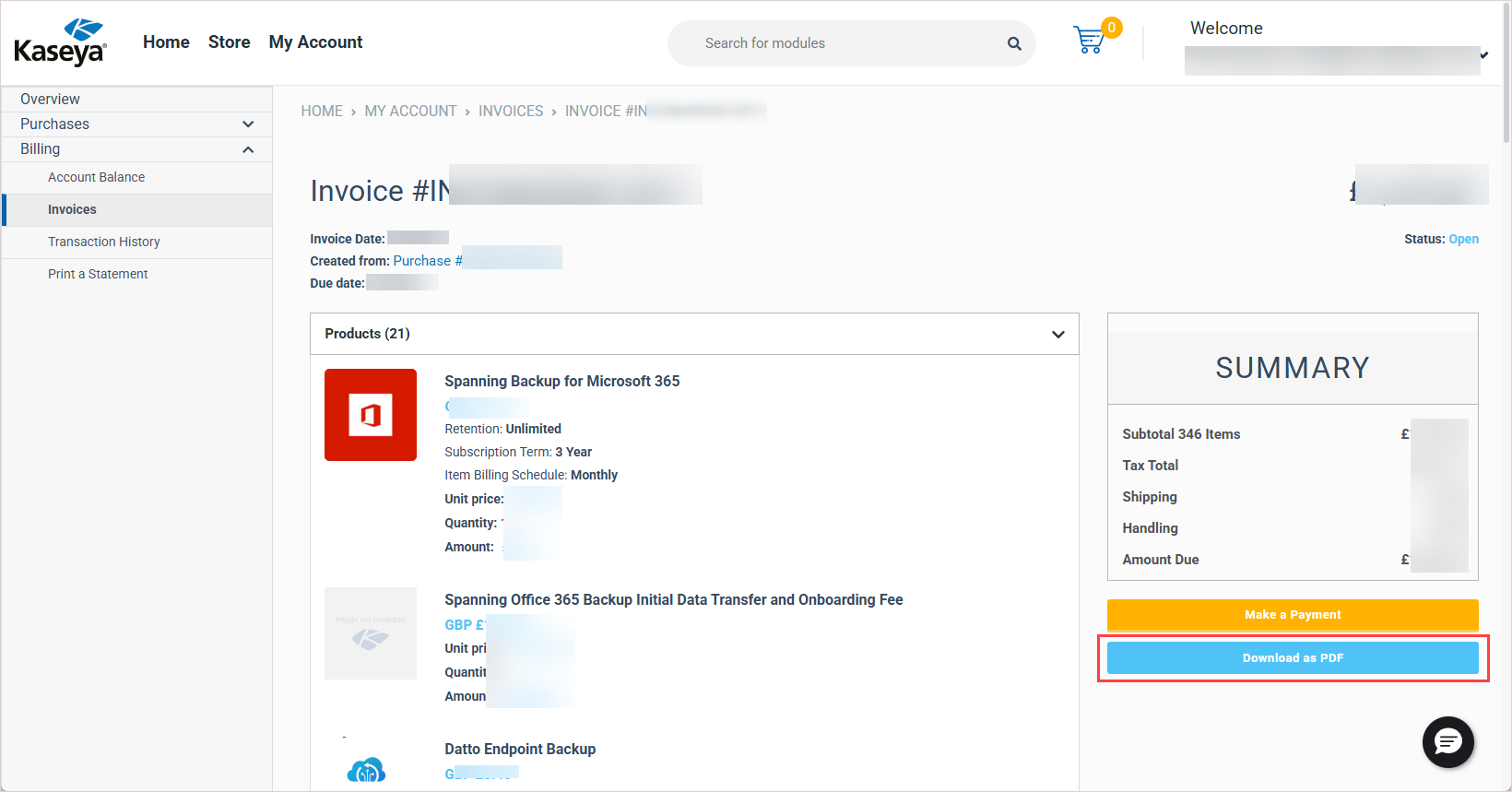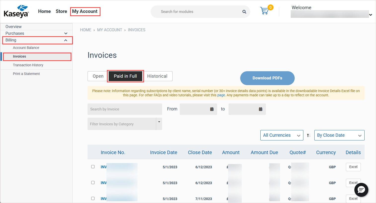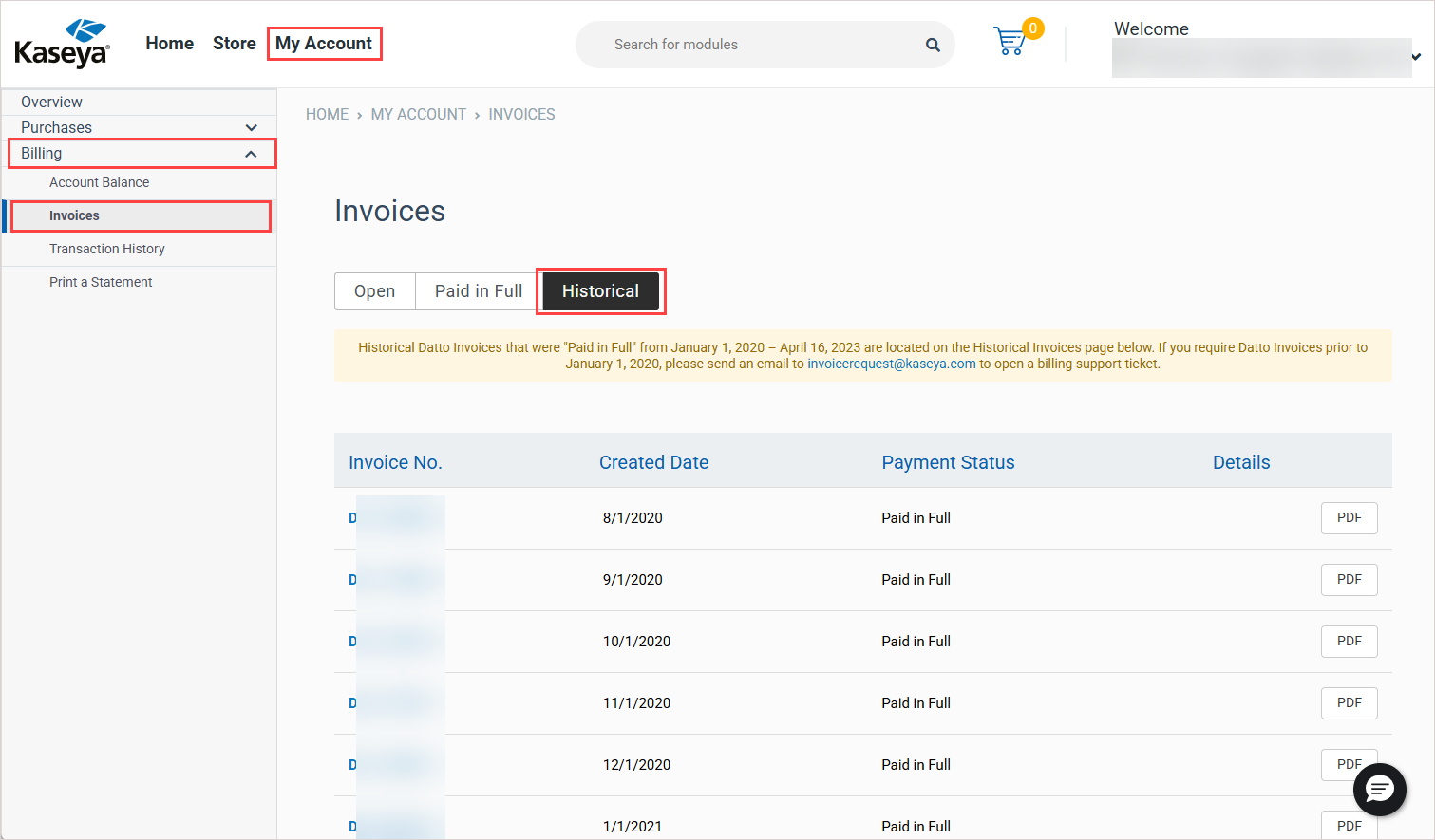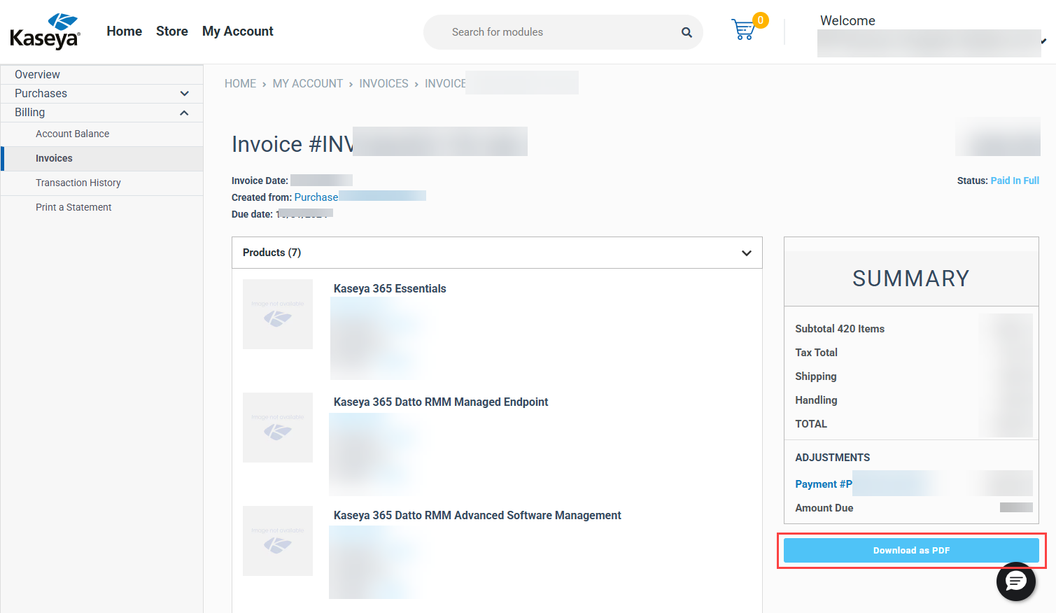In Kaseya Store, navigate to My Account > Billing > Invoices.