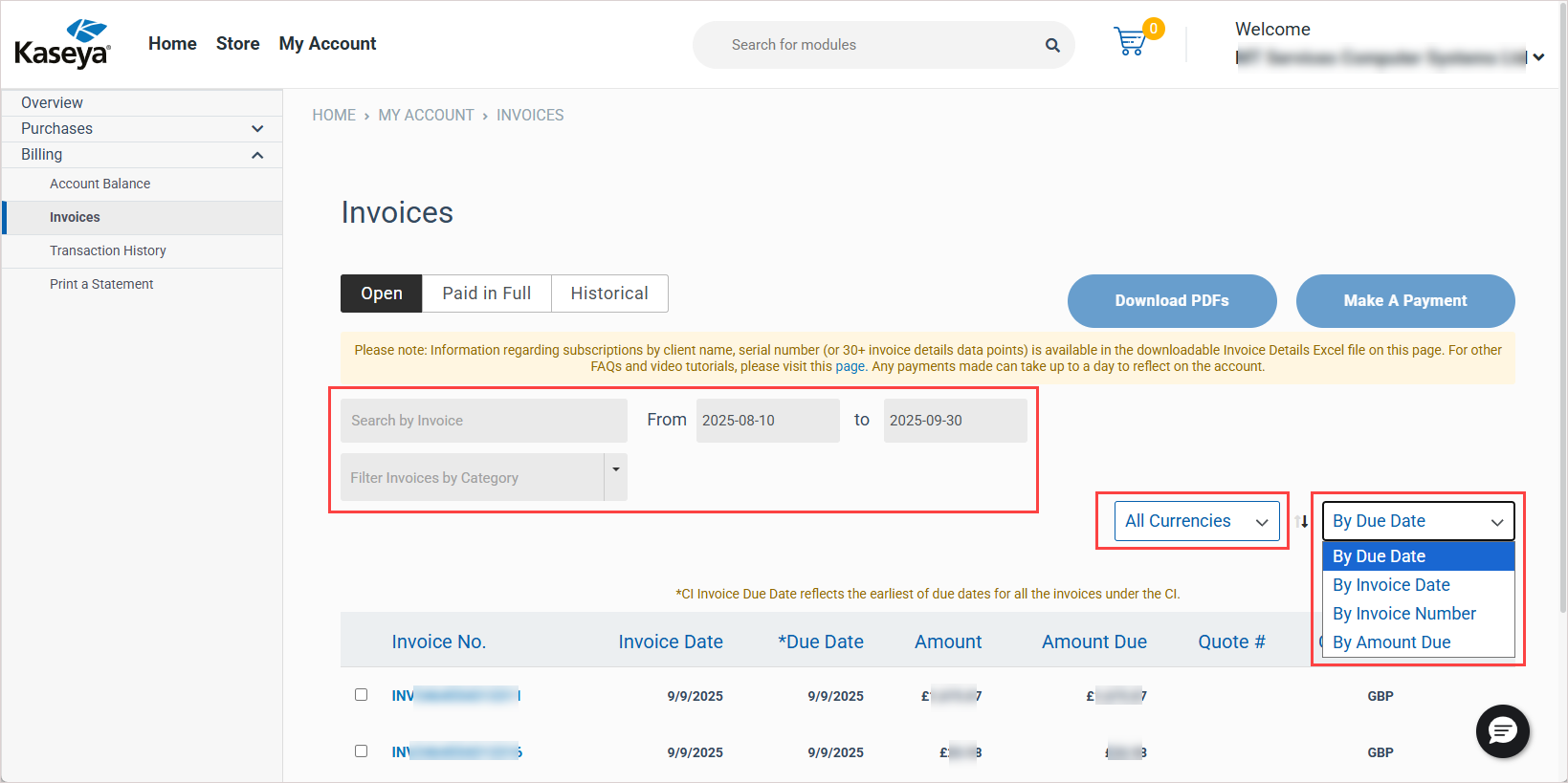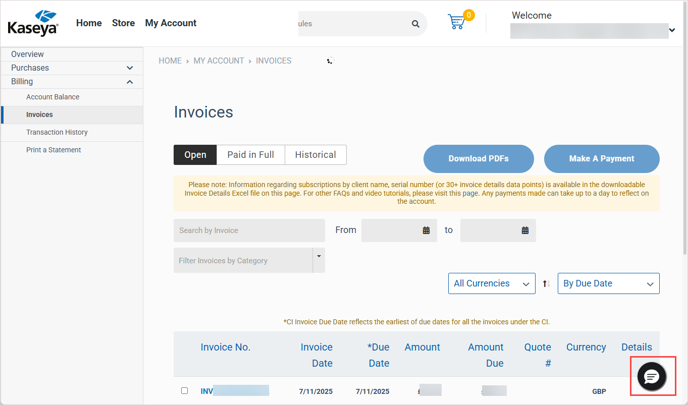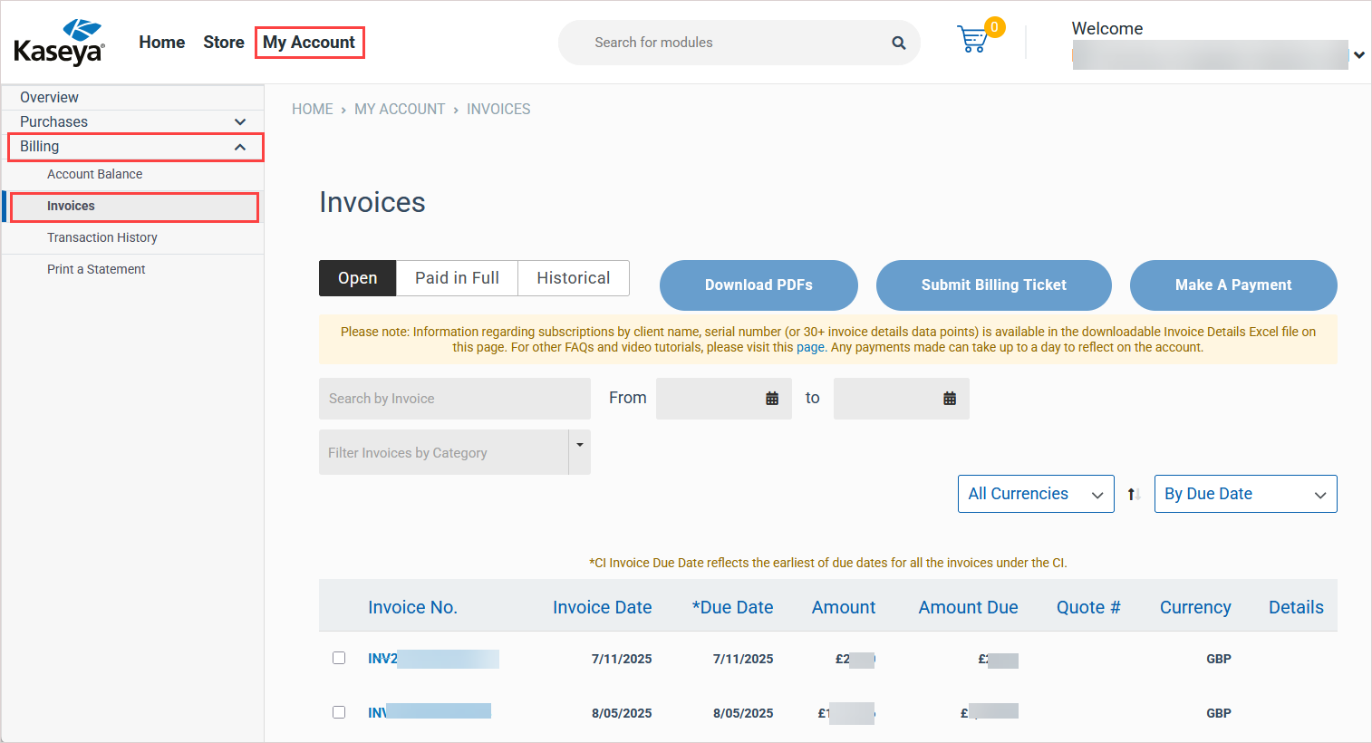 In Kaseya Store, navigate to My Account > Billing > Invoices. Open invoices display on the Open tab.