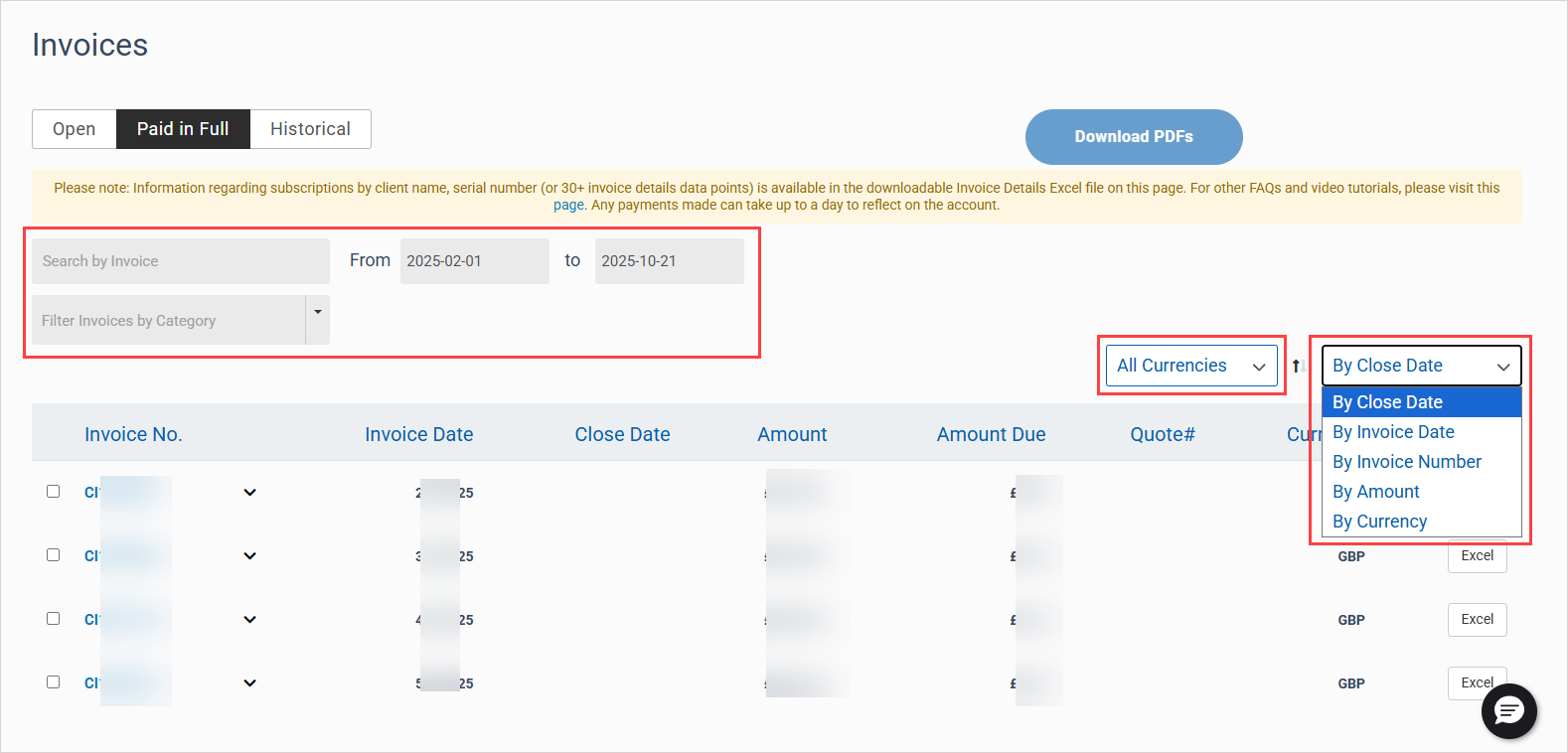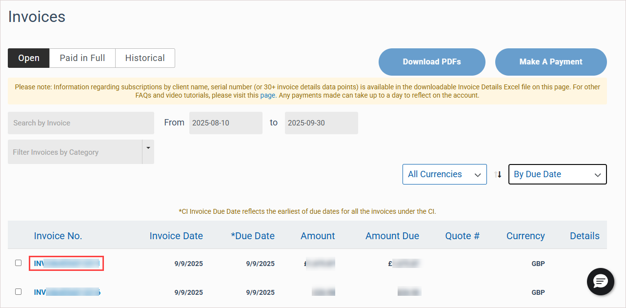 In the invoices list, locate the invoices you would like to view or download. If needed, you can filter and search the list by invoice number, date range, due date, invoice date, currency, and so on.