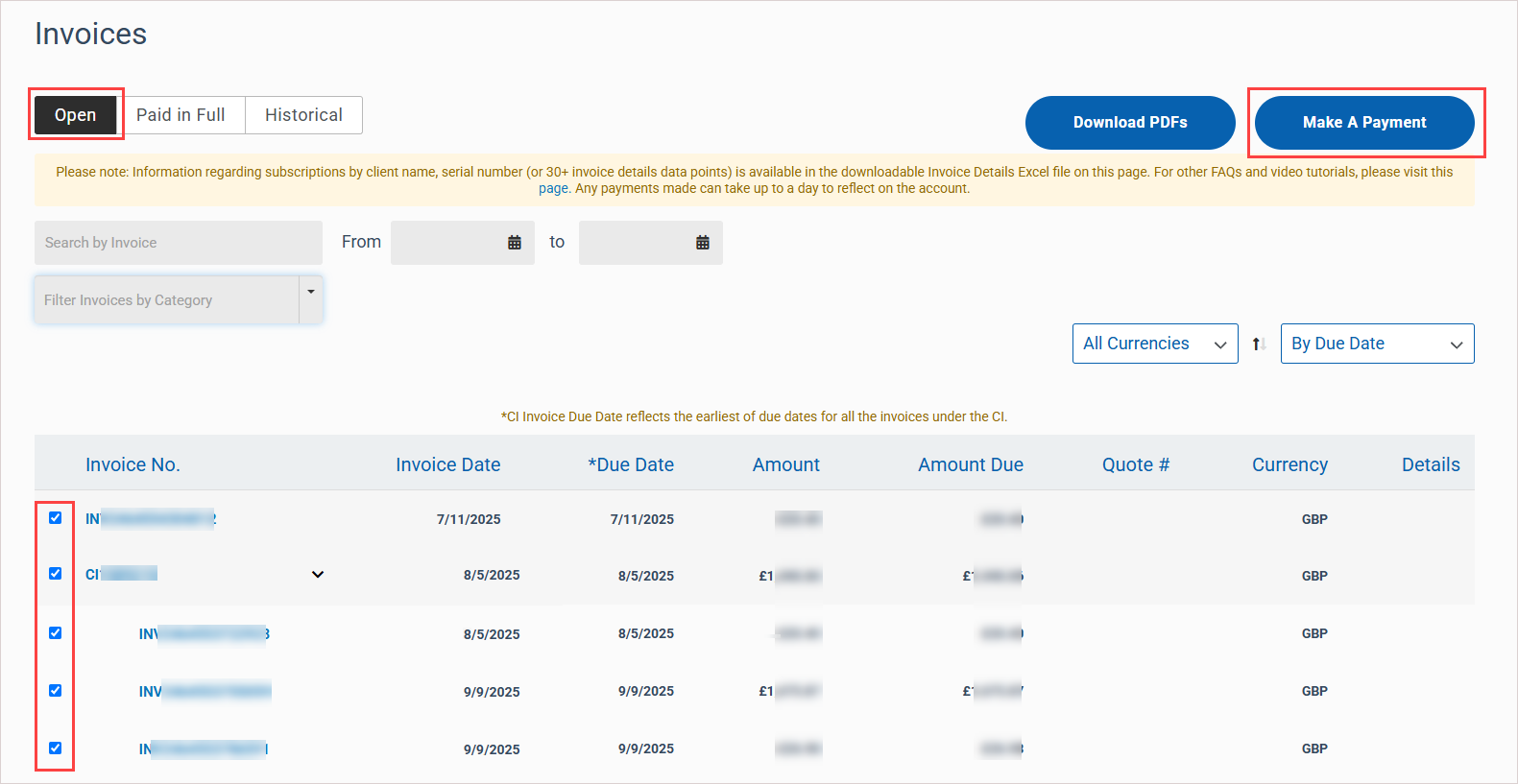 Select the check box next to each invoice where you want to make a payment. (To find invoices you can filter and search the list by invoice number, date range, due date, invoice date, currency, and so on.)